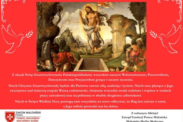 Z okazji Świąt Zmartwychwstania Pańskiego składamy wszystkim naszym Wolontariuszom, Pracownikom, Darczyńcom oraz Przyjaciołom gorące i szczere życzenia. Niech Chrystus Zmartwychwstały będzie dla Państwa zawsze siłą, nadzieją i życiem. Niech moc płynąca z Jego zwycięstwa nad śmiercią rozpala Waszą codzienność, obejmuje wszystkie troski rodzinne i wspiera w trudach pracy zawodowej oraz tej pełnionej w służbie […]